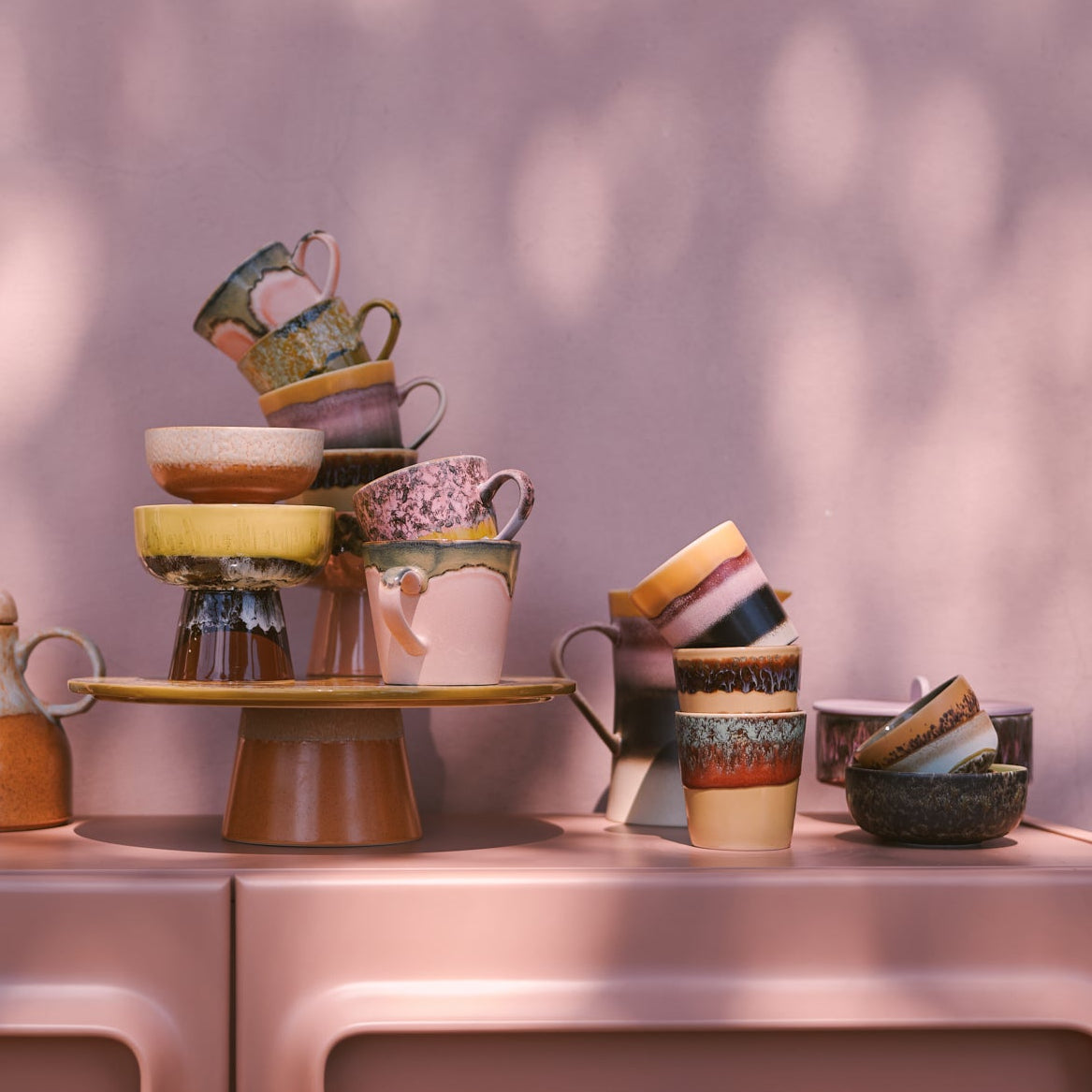 The perfect cup for a slow coffee. This 70s style ceramics collection brings a touch of nostalgia and warmth to your table with its exciting earthy colour compositions and hand-finished textures, making every cup unique. The natural base and ombre stripes of colour is reminiscent of the setting sun.