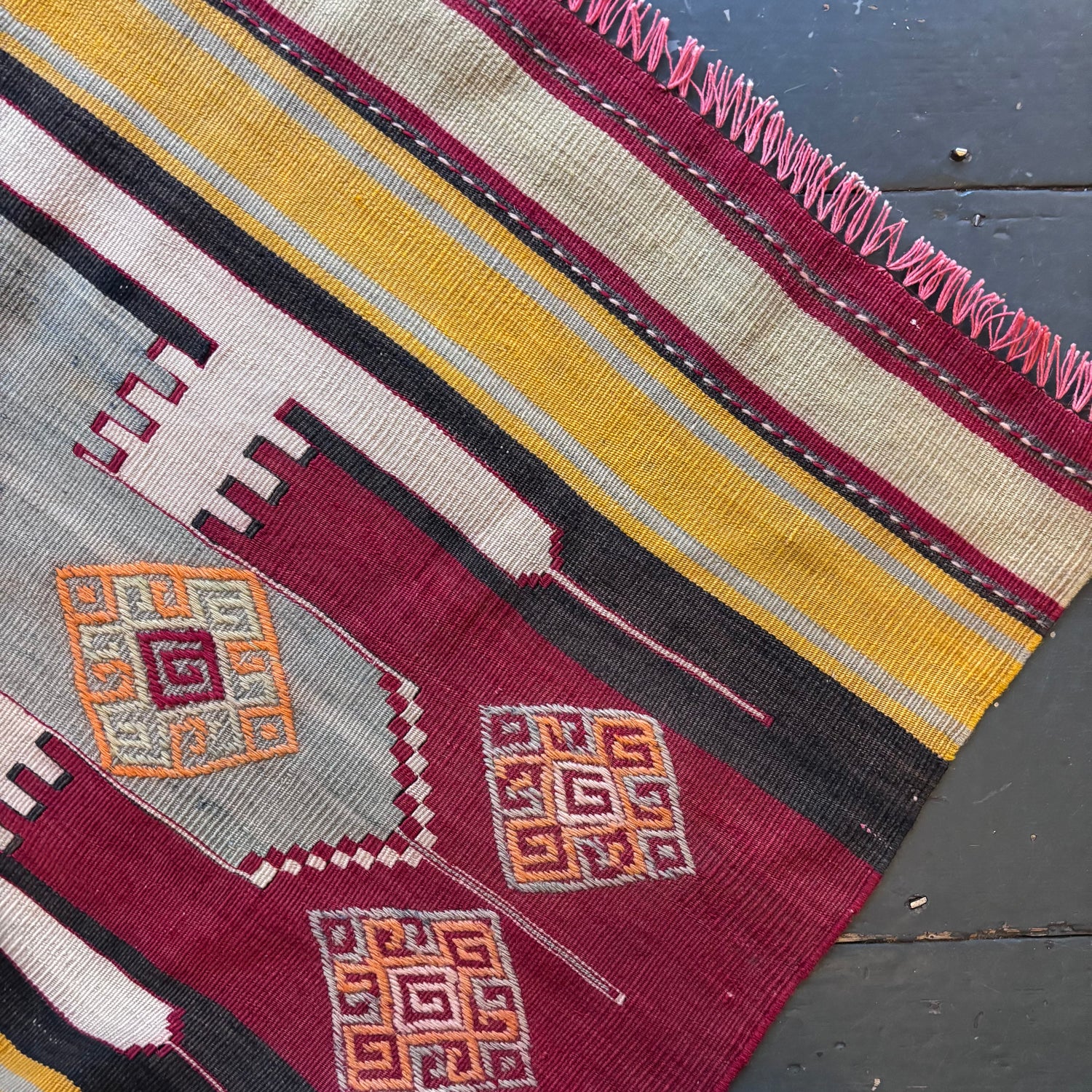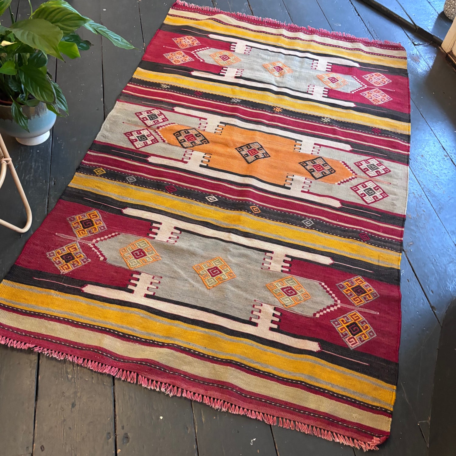 A vintage Turkish kilim with a geometric medallion design set against horizontal stripes. The striking pattern is typical in the Anatolia region of Turkey. Very good vintage condition.