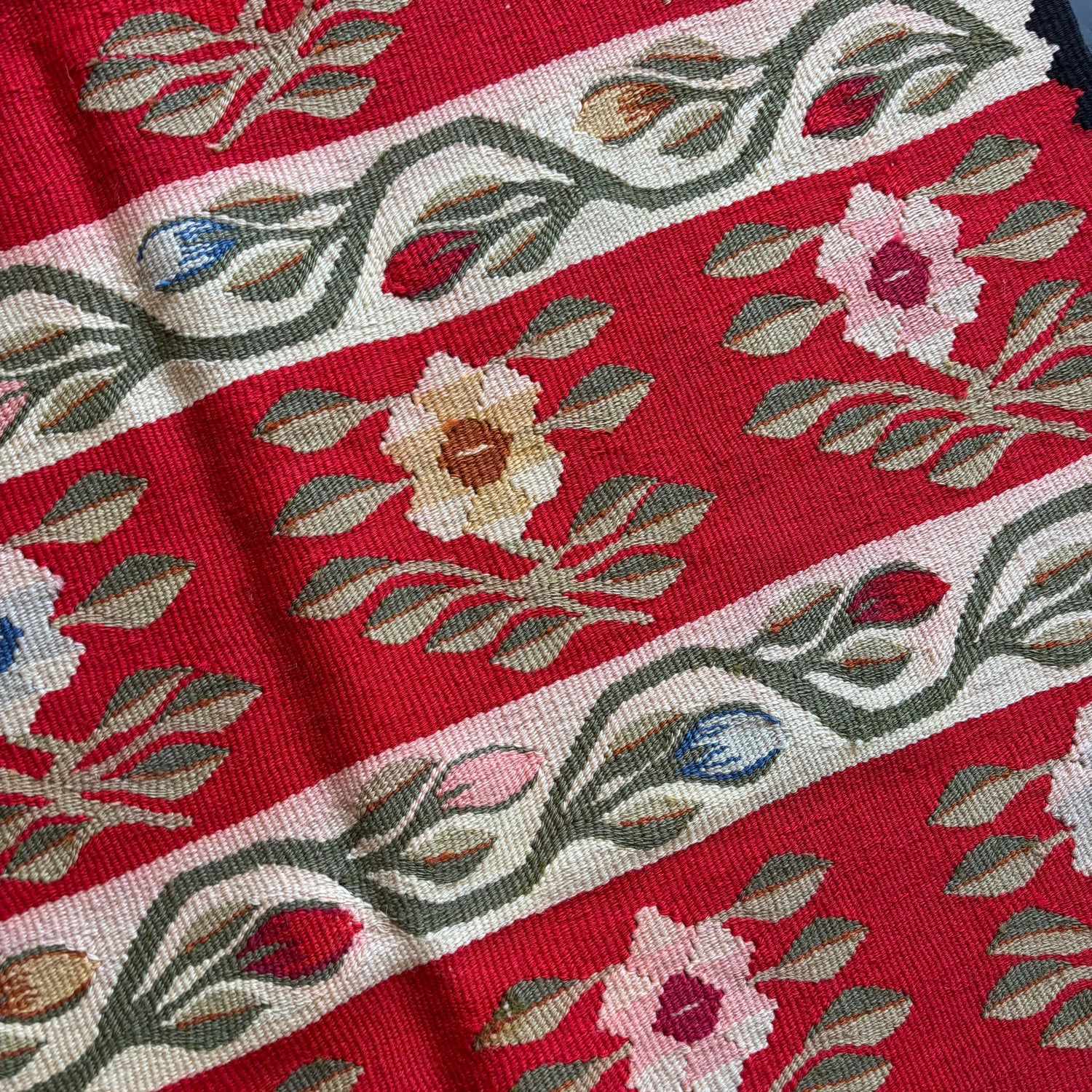 A vintage Moldovian kilim rug characterised by its horizontal stripes of stylised flowers motifs and vine pattern. Very good vintage condition.