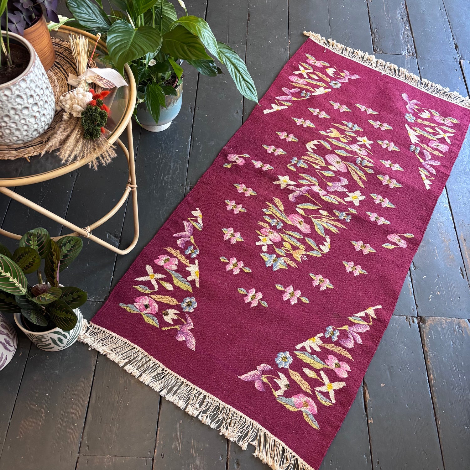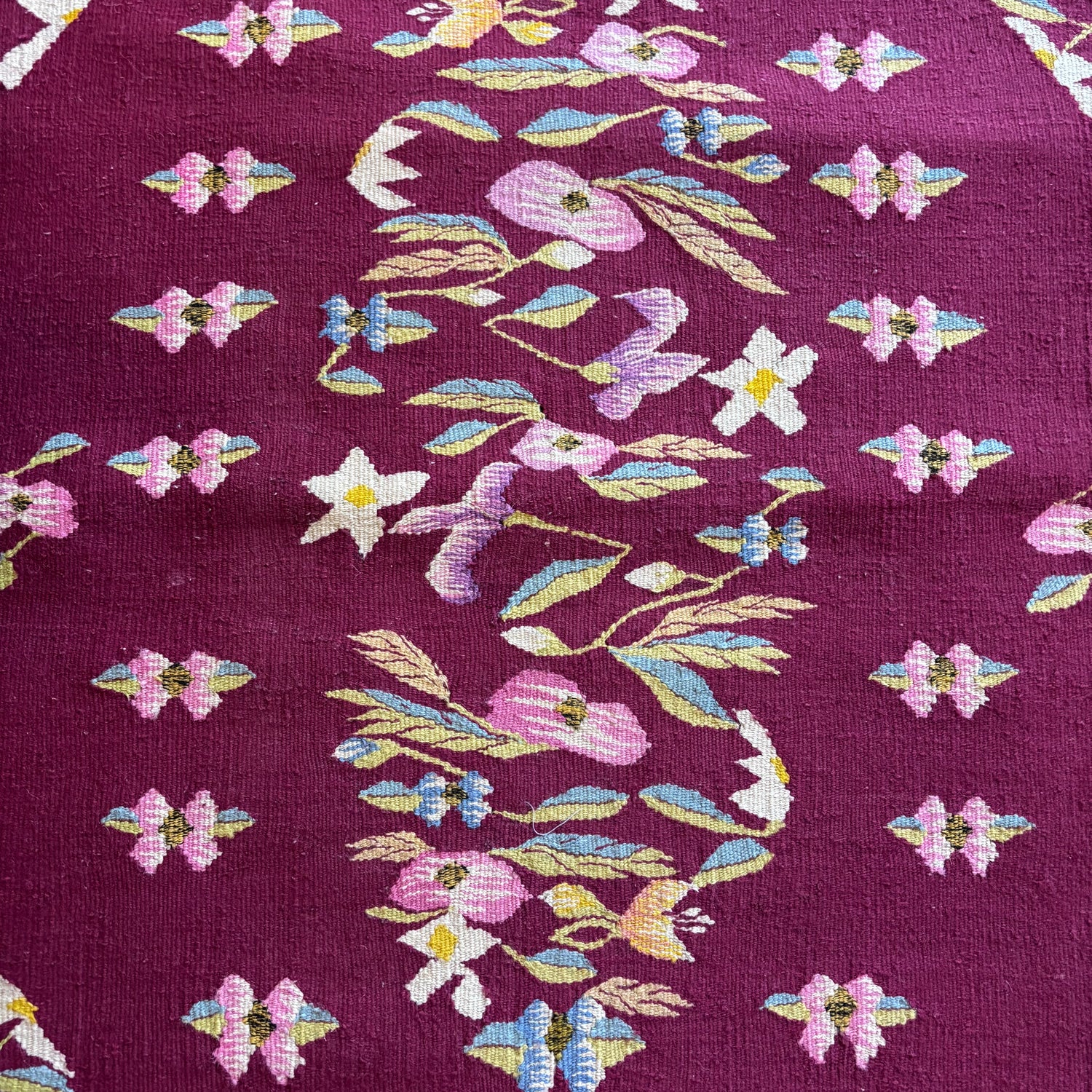 A pretty little rug with a floral design on a burgundy background, typical to the Oltenian region of Romania. This rug has been hung so is in in good vintage condition. Some of the hanging loops still remain.